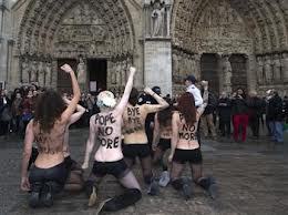 Напомним, во вторник утром восемь активисток феминистского движения Femen с истошными воплями и, естественно, обнаженные ворвались в неф Собора Парижской Богоматери. Таким образом они решили "отпраздновать уход Папы" Бенедикта XVI. Предварительно феминистки известили о своей акции "прощай папа" корреспондентов нескольких либеральных СМИ.