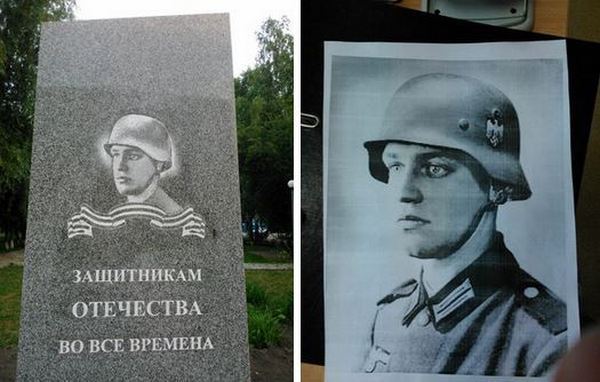 Вот только не совсем понятно, защитникам какого именно отечества этот памятник, так как оказалось, что на нем изображен Вернер Гольдберг — военнослужащий вермахта частично еврейского происхождения, послуживший фотомоделью в нацистской пропаганде как "идеальный германский солдат".
