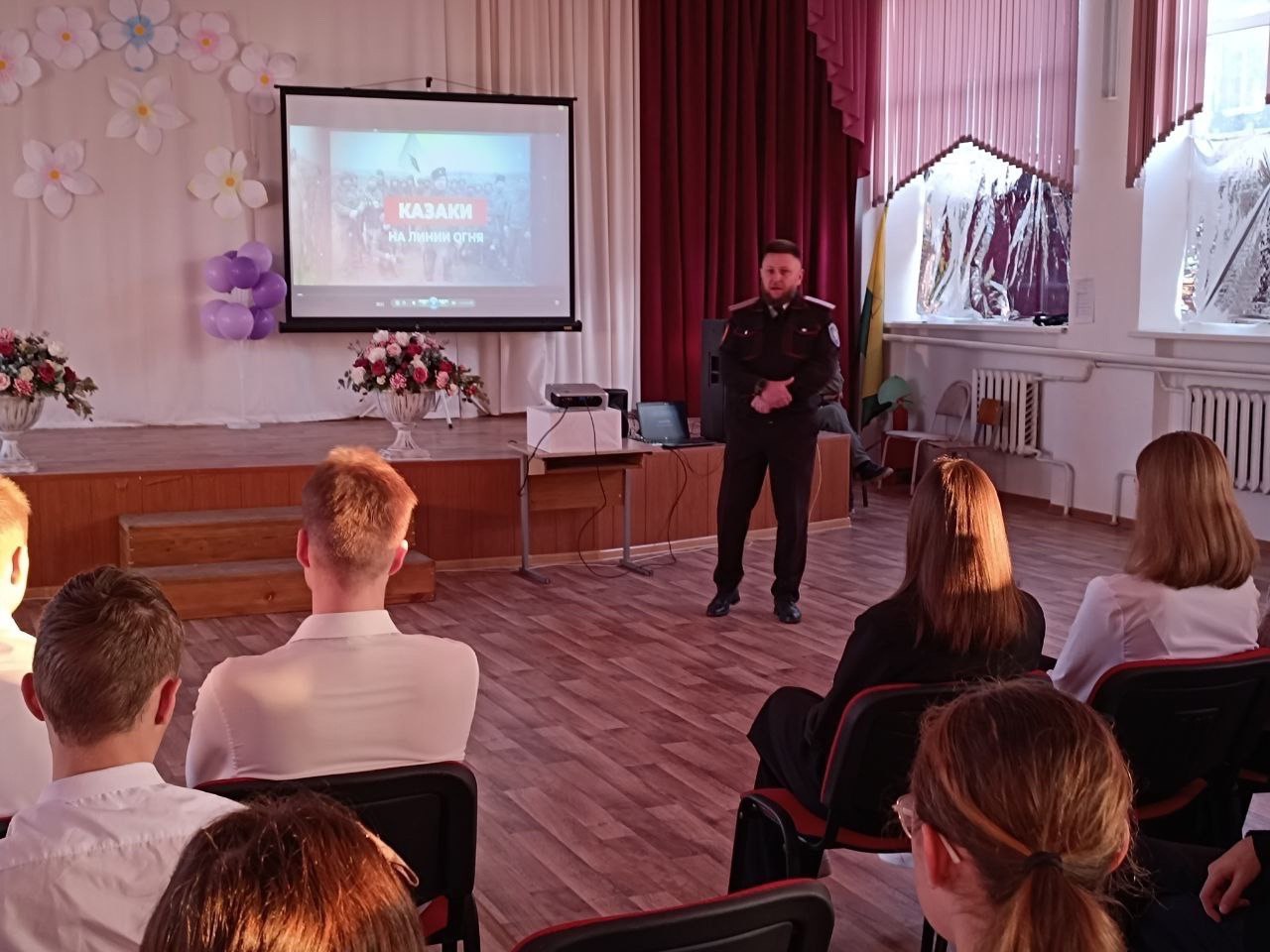 Евгений Саломаха, атаман Фастовецкого хуторского казачьего общества, поделился этой информацией с учениками девятых классов школы № 3, находящейся в станице Фастовецкой, в ходе урока мужества, посвященного проекту "Казаки на линии огня". На мероприятии юные слушатели узнали о героизме местных станичников и членов Кубанского казачьего войска, которые выполняют боевые задачи на линии боевого соприкосновения.