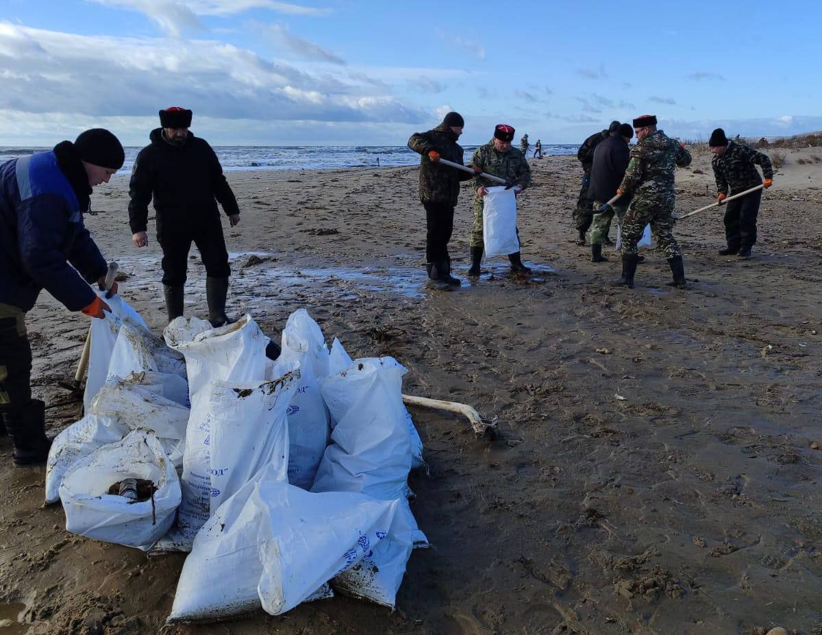 Значительный вклад в очистку побережья вносит Анапское районное казачье общество, выставившее 400 своих представителей. Еще более масштабный контингент — порядка 1500 казаков — предоставило Темрюкское районное казачье общество. Эти казаки неустанно трудятся, очищая пляжи от нефтепродуктов, вынесенных штормом на берег, и собирая загрязненный песок в мешки для последующей утилизации.