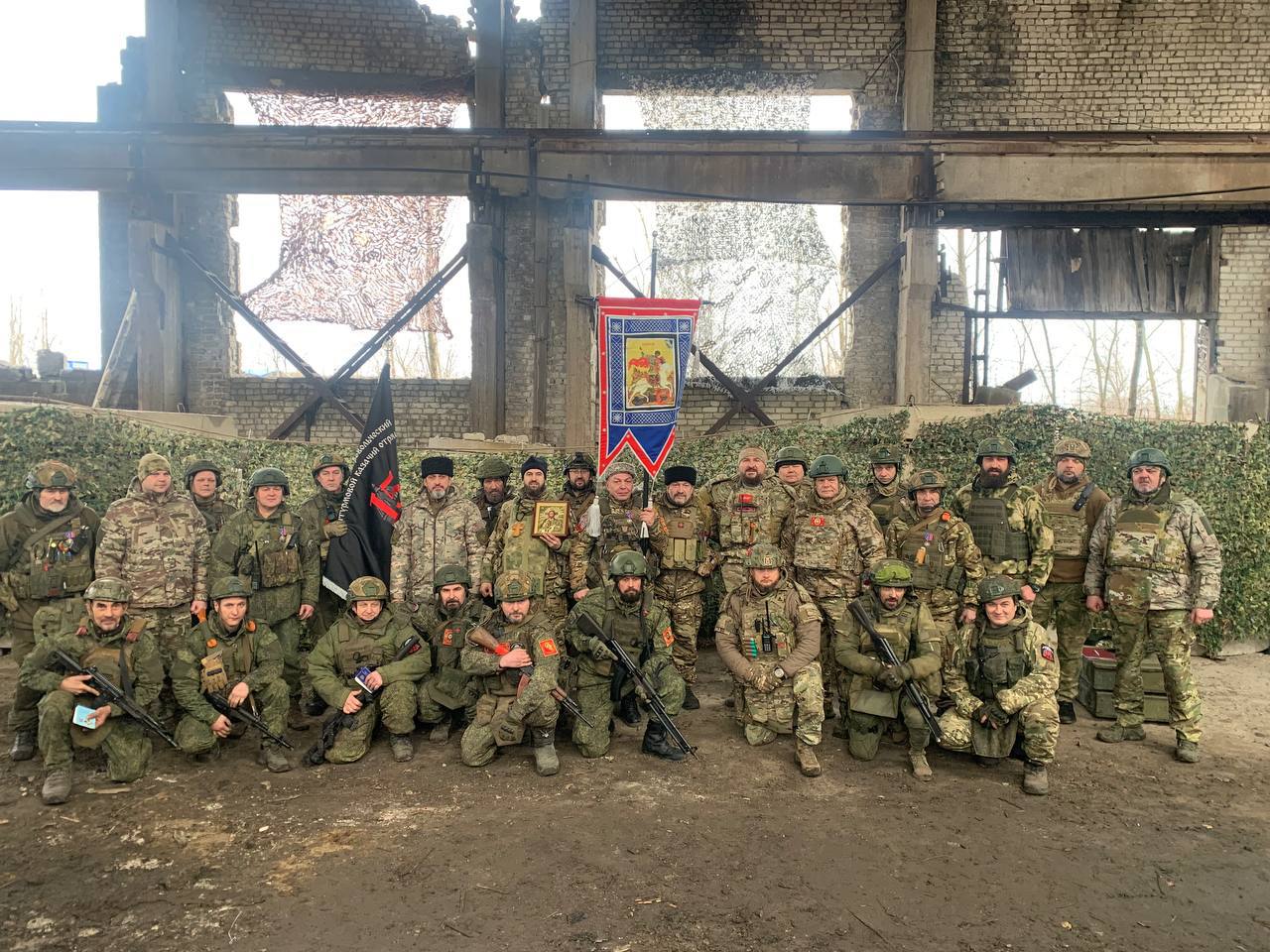 Офицеры штаба Всероссийского казачьего общества и атаман Виталий Кузнецов лично передали эти священные символы казачьей доблести и воинской чести бойцам батальона. Знамя и хоругвь были освящены летом прошлого года в храме Георгия Победоносца священником Волжского казачьего войска протоиереем Сергием.