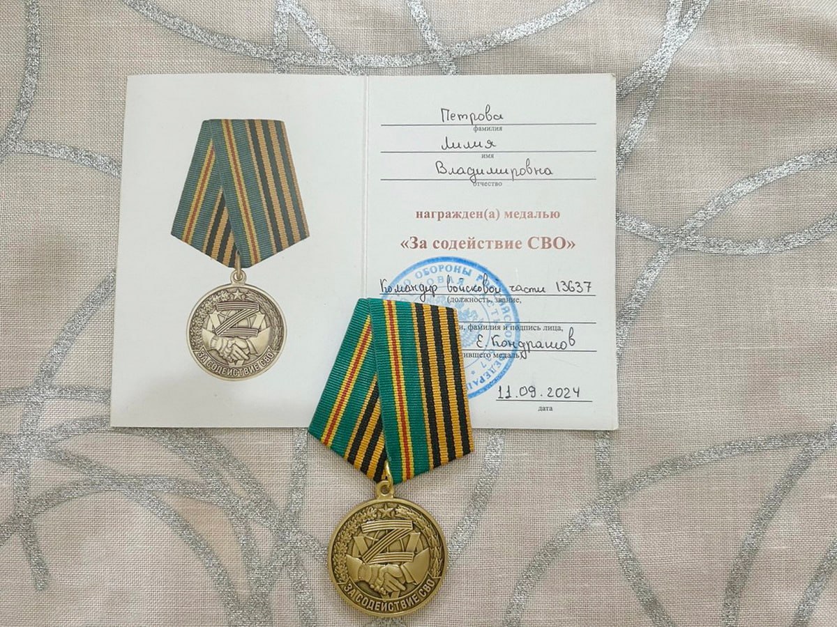 В Тацинском казачьем кадетском техникуме Ростовской области состоялось торжественное вручение медалей "За содействие СВО". Награды были вручены директору техникума Лилии Петровой, старшему воспитателю Надежде Будариной и мастеру производственного обучения по профессии "сварщик" Александру Медведеву. Председатель Совета ветеранов боевых действий Тацинского района Николай Нефедов передал им медали по поручению командира войсковой части 13637, выразив, таким образом, благодарность от лица военных за активную гражданскую позицию коллектива учебного заведения.