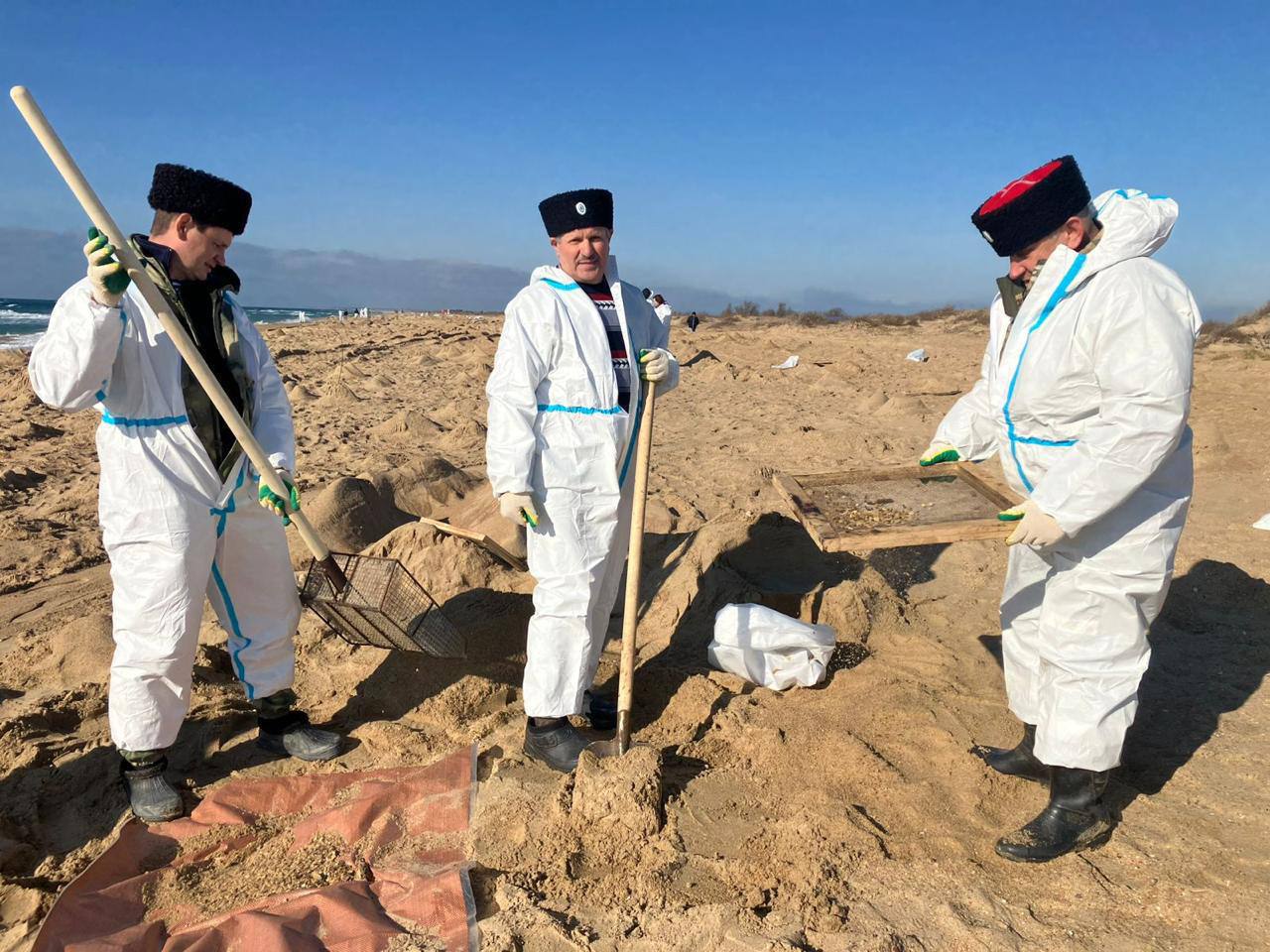 Так, казаки Нововеличковского хуторского казачьего общества, под руководством начальника штаба Николая Прокопенко, работают в районе станицы Благовещенской. Их основная задача — очистка береговой линии от нефтепродуктов. Казаки вручную просеивают песок, тщательно извлекая фрагменты мазута.