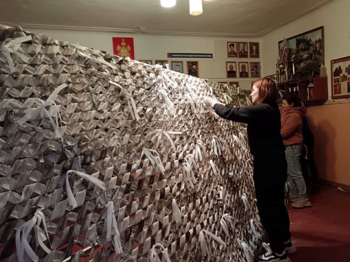 В станице Гривенской Калининского района в штабе местного казачьего общества заработал пункт плетения маскировочных сетей для бойцов, находящихся на передовой. Эта инициатива возникла в ответ на острый спрос на средства маскировки в зоне боевых действий.