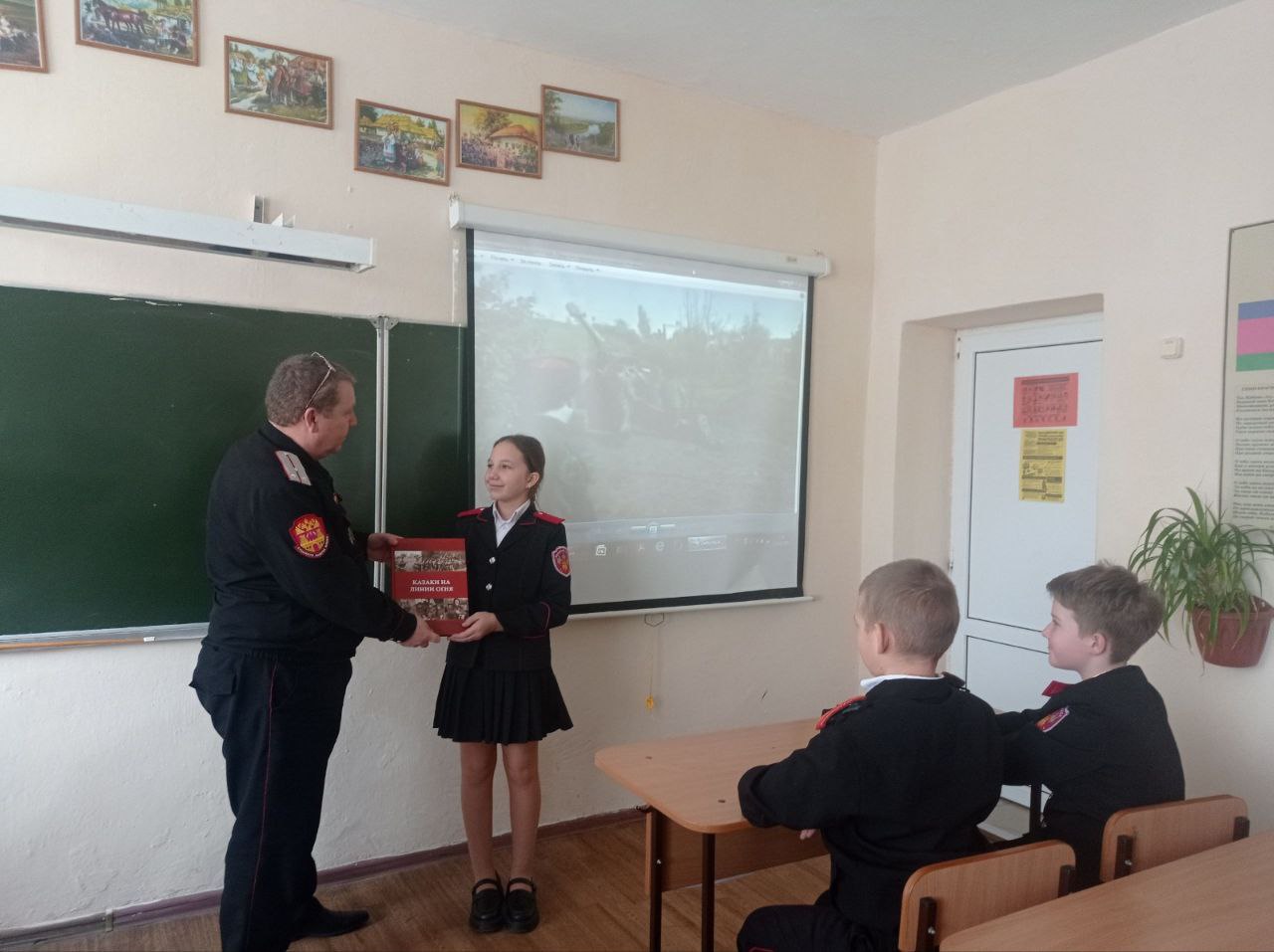 В завершение урока мужества наставник вручил казачатам экземпляр книги "Казаки на линии огня". Этот подарок позволит ребятам подробнее ознакомиться с историями казаков-героев и послужит важным вкладом в их патриотическое воспитание.