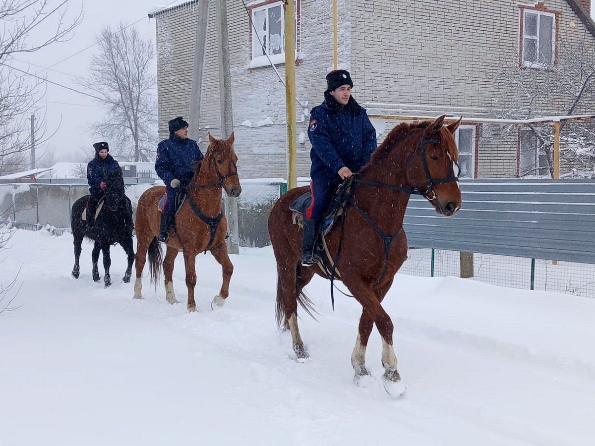 Выбор конного патруля был обусловлен необходимостью тщательного осмотра труднодоступных мест и большей мобильностью в условиях городской застройки. Перед выходом на патрулирование командир взвода провел подробный инструктаж по технике безопасности, учитывая сложные погодные условия — гололед и налипание снега на копыта лошадей.