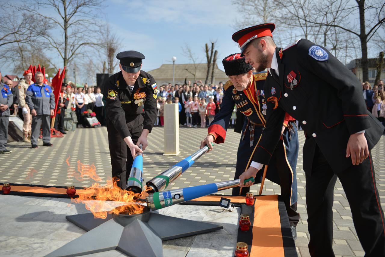 Частицу пламени доставили из Краснодара, с мемориального комплекса "Вечный огонь", посвящённого кубанцам, павшим в борьбе за Родину. Честь зажечь Вечный огонь в Динском районе была предоставлена: почётному жителю Нововеличковского сельского поселения, председателю Совета стариков хуторского казачьего общества Виктору Костенко, председателю Союза казачьей молодёжи Кубани, кавалеру ордена Мужества Даниилу Дьяченко, ветерану боевых действий, участнику СВО и курсанту Краснодарского высшего военного училища имени Штеменко.