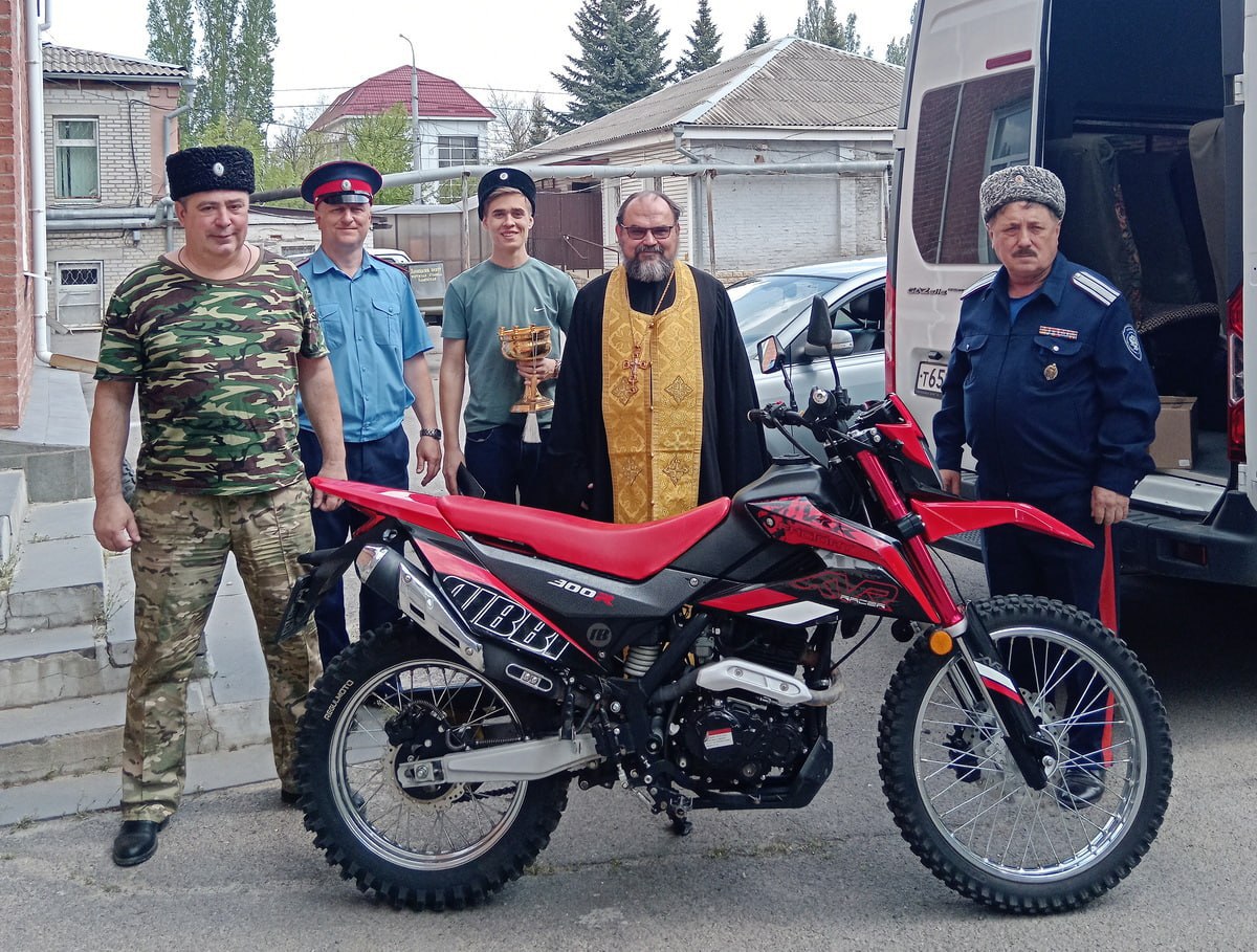 На встрече обсуждались актуальные вопросы доставки гуманитарной помощи бойцам, несущим службу в зоне СВО. В преддверии Дня Победы была собрана партия необходимых вещей, включающая продукты питания, медикаменты, средства гигиены и другие предметы первой необходимости. Кроме того, прихожане храма, окормляемого отцом Василием, передали казакам-добровольцам мотоцикл. Перед отправкой гуманитарный груз был освящён протоиереем Василием Хадыкиным.