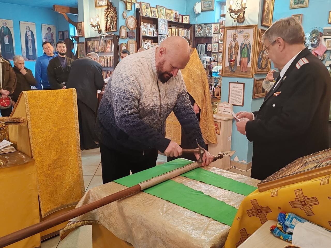 Торжественная церемония прибития знамени к древку и его освящения прошла в Свято-Вознесенском храме станицы Пашковской. Обряд совершили иерей Виктор Аникин и диакон Аркадий Шилов.